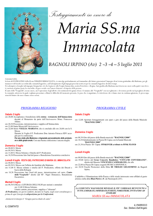 Carissimi fedeli, la festa del PATROCINIO della SS.ma Vergine Immacolata, ci coinvolge profondamente nel tramandare alle future generazioni l’impegno di un’eterna gratitudine alla Madonna, per gli innumerevoli benefici accordati alla comunità bagnolese, nell’adempimento degli impegni presi dai nostri avi per la comunità bagnolese di tutti i tempi.Sabato 2 luglio
