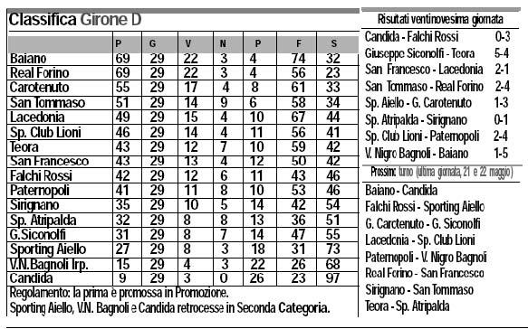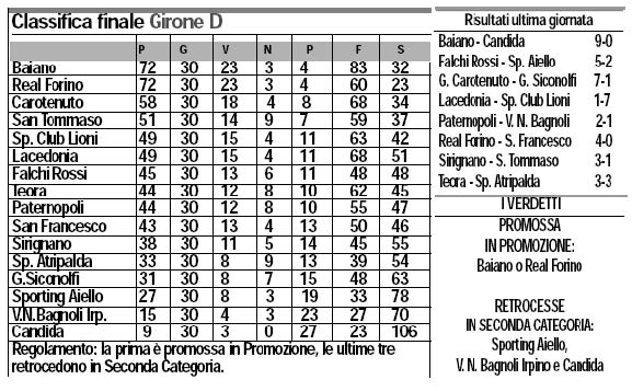 Commento: Contro la capolista il Bagnoli, nonostante una formazione largamente rimaneggiata, con in porta l’attaccante Infante D. e in dieci dal 15’ del primo tempo per l’infortunio di Nigro G., è uscito a testa alta e il punteggio di 1 a 5 è senz’altro troppo punitivo e non rispecchia appieno la gara. I ragazzi hanno dato il massimo e fino al goal di Fornaro al 32’ del primo tempo, se c’era una squadra che meritava il vantaggio questa era senza alcun dubbio il Bagnoli. E’ chiaro che poi il gioco, le individualità e la preparazione atletica hanno fatto la differenza. Il campionato ha dato i suoi definitivi verdetti per quando riguarda le retrocessioni, insieme al Bagnoli e al Candida retrocede l’Aiello. Per quando riguarda la testa della classifica tranne grosse sorprese, il campionato terminerà con lo spareggio tra il Forino ed il Baiano.