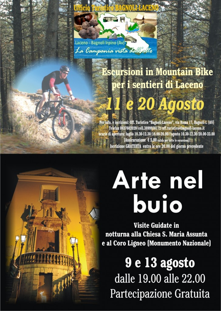 Sempre su iniziativa del Consorzio Turistico si organizzano: nei giorni 11 e 20 agosto “Escursioni in Mountain Bike per i sentieri di Laceno” ; e nei giorni 09 e 13 agosto “Arte nel Buio”, visite guidate in notturna alla Chiesa Santa Maria Assunta e al Coro Ligneo (Monumento Nazionale).