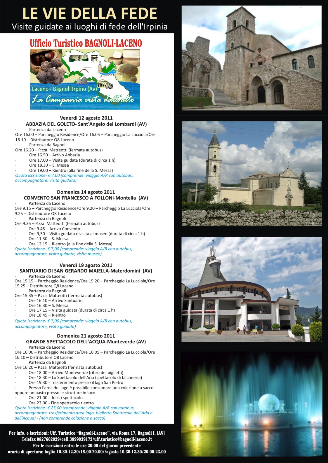 Il Consorzio Turistico Bagnoli-Laceno organizza per il prossimo mese di agosto 4 visite guidate presso alcune delle località irpine ritenute di maggiore interesse religioso: venerdì 12 agosto “L’ Abazia del Goleto” a Sant’Angelo dei Lombardi; domenica 14 agosto il “Convento di San Francesco a Folloni” a Montella; venerdì 19 agosto il “Santuario di San Gerardo Maiella” a Materdomini; domenica 21 agosto il” Grande spettacolo dell’Acqua” a Monteverde.
