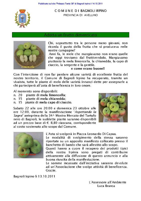 Durante la manifestazione ci sarà l’Asta di beneficenza delle Piante dimenticate (Mela Chianedda – Capo di Ciuccio – Limoncella – Zitella) , iniziativa quest’ultima a cura dell’Assessorato all’Ambiente del Comune di Bagnoli Irpino.