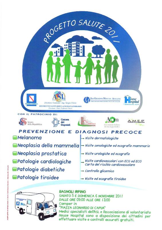 L’Asl di Avellino in collaborazione con l’Azienda Ospedaliera Moscati di Avellino e con l’Associazione di volontariato House Hospital onlus, nonchè con la disponibilità dei Comuni ospitanti, attraverso questa lodevole iniziativa, sta portado a compimento un’itinerante campagna di prevenzione e di informazione su tutto il territorio provinciale, dove si pone tra i campi di interesse principali la prevenzione e la diagnosi precoce delle malattie dermatologiche come il melanoma, delle patologie della tiroide, delle patologie cardiovascolari, delle patologie ginecologiche, del diabete, delle patologie prostatiche.
