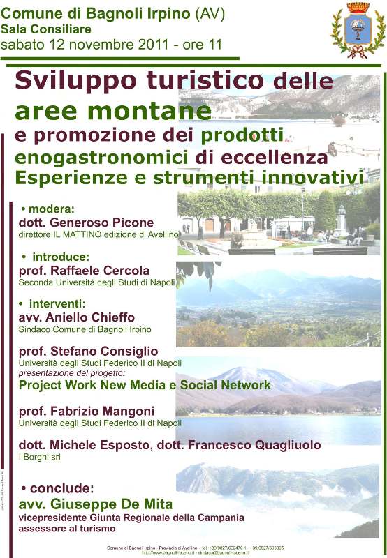 L’appuntamento è promosso dal Comune di Bagnoli Irpino. I lavori saranno introdotti dal professore Raffaele Cercola, docente di Marketing Territoriale e Marketing Strategico presso la Seconda Università di Napoli. A seguire gli interventi che saranno affidati all’avvocato Aniello Chieffo, Sindaco di Bagnoli Irpino, al professore Stefano Consiglio, docente di Organizzazione Aziendale presso l’Università Federico II di Napoli che presenterà il progetto “Project work new media e social network”, al professore Fabrizio Mangoni, docente di Urbanistica presso l’Università Federico II di Napoli, al dottor Michele Esposto e al dottor Francesco Quagliuolorappresentanti de “I Borghi srl”, società che si occupa di promuovere e sviluppare progetti valorizzazione turistico-immobiliare di borghi e centri storici. L’incontro sarà moderato da Generoso Picone, direttore della redazione di Avellino del quotidiano “Il Mattino”. Le conclusioni saranno affidate all’onorevole Giuseppe De Mita, Vice Presidente della giunta regionale della Campania ed Assessore regionale al Turismo e ai Beni Culturali.