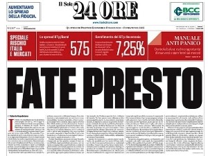 Ma un altro sisma sta colpendo il nostro paese. Non ne avvertiamo le scosse fisiche, non tutti siamo consapevoli delle immediate conseguenze, ma giorno dopo giorno è sempre più forte e distruttivo: «un “terremoto” finanziario e globale scuote le fondamenta, ne mina pesantemente la tenuta economica e civile; la credibilità perduta ci fa sprofondare in un abisso». A parlare, anzi a scrivere, è un altro direttore, un altro Roberto, dalle pagine di un altro autorevolissimo quotidiano: IlSole24Ore, a firma di Napoletano, così titola l’edizione odierna del giornale e del sito: FATE PRESTO.