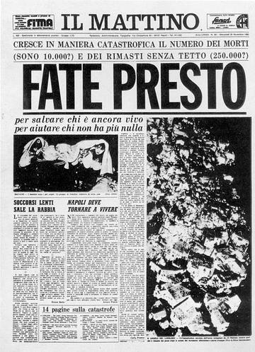 FATE PRESTO per salvare chi è ancora vivo, per aiutare chi non ha più nulla”: con questo titolo si presentò ai suoi lettori il Mattino nazionale, all’alba del 26 novembre 1980. Pochi giorni dopo il terribile sisma che sconvolse l’Irpinia, uno dei maggiori organi di stampa di allora e di oggi, decise di usare tutta l’efficacia che poteva venire dal “quarto potere”, per lanciare un grido d’allarme, di speranza, di paura, di rabbia. FATE PRESTO. Non perdete tempo, non fate i soliti italiani che per stare dietro alla burocrazia fanno passare i giorni, i mesi e gli anni, voleva forse dire Roberto Ciuni, direttore del Mattino dell’epoca e ideatore della titolazione.