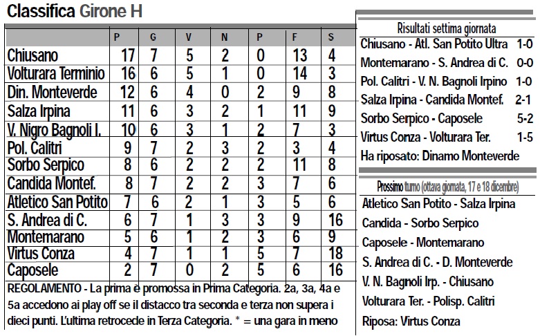 CAMPIONATO DI SECONDA CATEGORIA, GIRONE “H” – SESTA GIORNATA GIRONE DI ANDATA