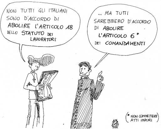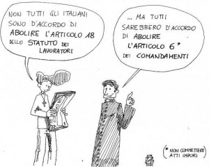 Se la Repubblica riconosce a tutti i cittadini il diritto al lavoro e promuove le condizioni che rendano effettivo questo diritto… se la Repubblica tutela il lavoro in tutte le sue forme di applicazione… se l’organizzazione sindacale è libera… se il diritto di sciopero si esercita nell’ambito delle leggi che lo regolano … se l’iniziativa economica privata è libera ma non può svolgersi in contrasto con l’utilità sociale o in modo da recare danno alla sicurezza, alla libertà, alla dignità umana … allora l’articolo 18 dello Statuto dei Lavoratori non si tocca!!! (semmai lo si estende anche alle aziende con meno di quindici dipendenti!)