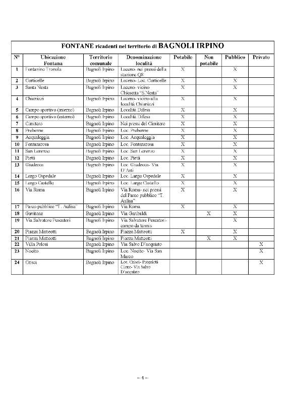 Seguiranno adesso le tabelle esplicative delle varie fontane, sorgenti e pozzi presenti su tutto il territorio di Bagnoli Irpino. Per alcune è stato effettuato anche il prelievo e quindi il successivo campionamento da parte del laboratorio di analisi presso l’Alto Calore.