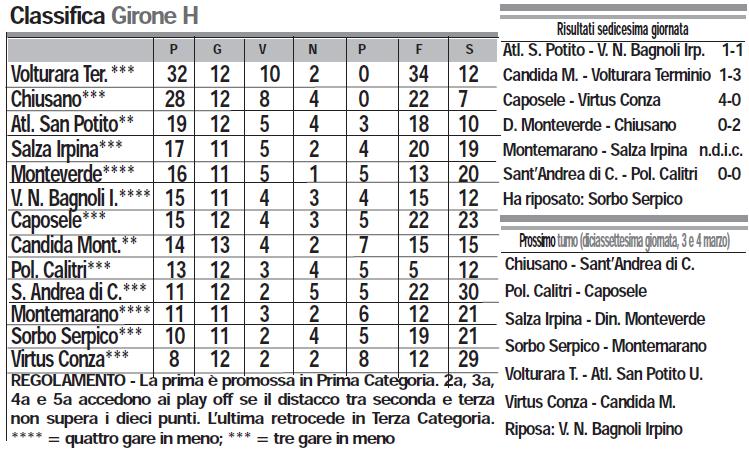 CAMPIONATO DI SECONDA CATEGORIA, GIRONE “H” – SEDICESIMA GIORNATA
