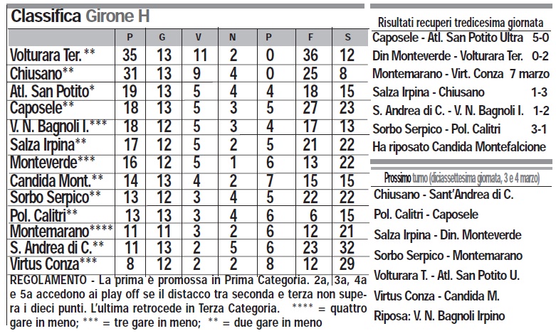 CAMPIONATO DI SECONDA CATEGORIA, GIRONE “H” – RECUPERO TREDICESIMA GIORNATA