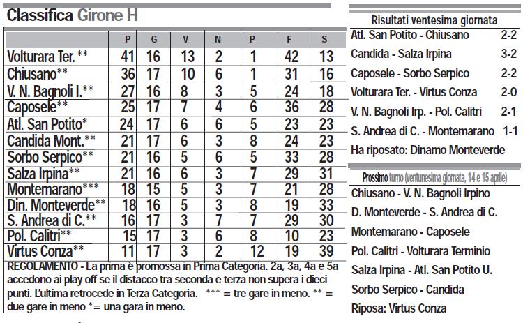 Domenica 1 aprile si giocherà alle ore 16 a Caposele.