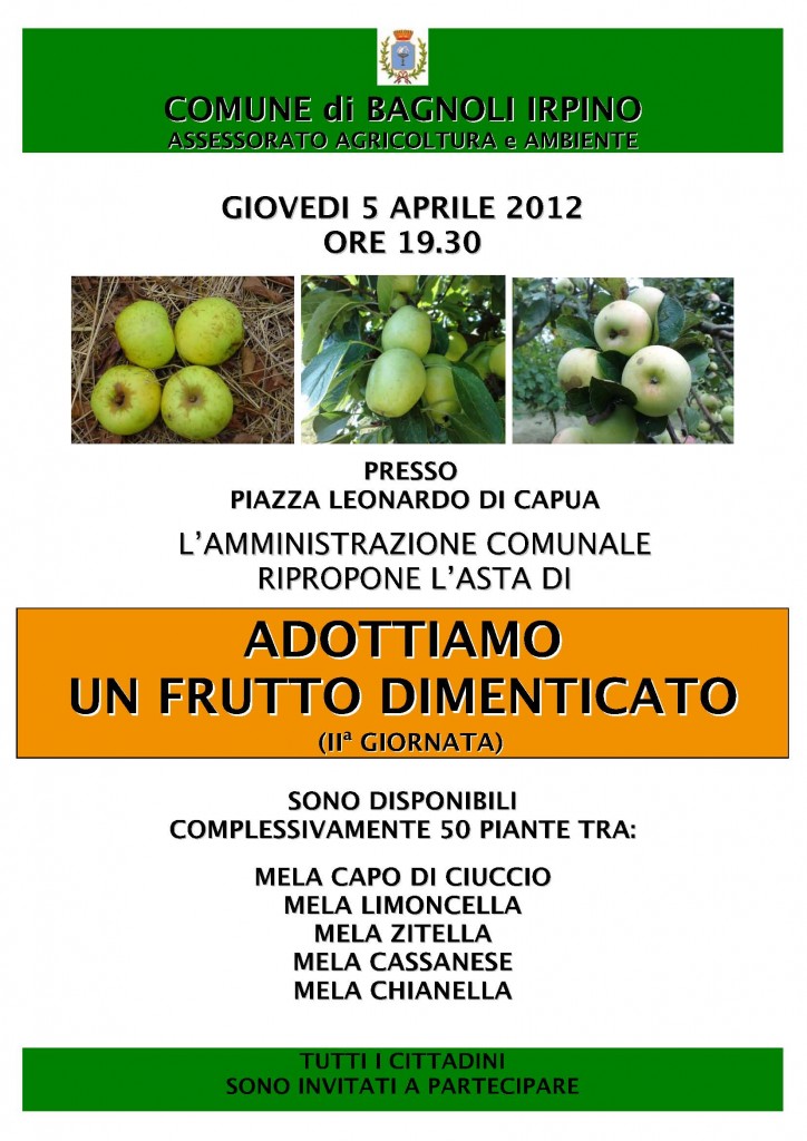 Si rende noto che giovedi 5 aprile 2012 dalle ore 19.30 presso Piazza Leonardo Di Capua a Bagnoli Irpino l’amministrazione comunale ripropone l’asta di “ADOTTIAMO UN FRUTTO DIMENTICATO”(2a Giornata).