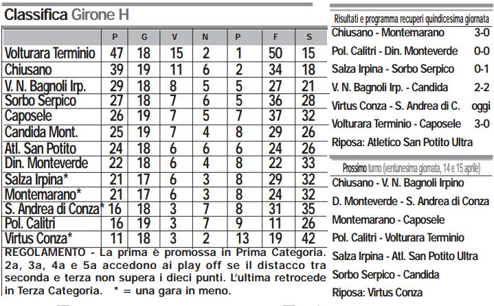Interviste: Il Presidente Nicastro ha accettato serenamente il verdetto del campo” Certo siamo stati sfortunati sui goal subìti, però c’è da dire che il Candida pure se non ha creato occasioni da goal, ha messo in mostra delle buone individualità ed ha pressato a tutto campo fino al 90’. Queste partite il più delle volte si possono anche perdere”. Il Mister non è invece soddisfatto ”avevamo la gara in pugno, non si possono offrire sul piatto d’argento due goal agli avversari, anche se hanno giocato bene, ma non hanno creato palle goal. Comunque adesso dobbiamo subito accantonare questo risultato e pensare alla difficile trasferta di Chiusano, dove una nostra vittoria potrebbe rimetterci in gioco per il secondo posto”.