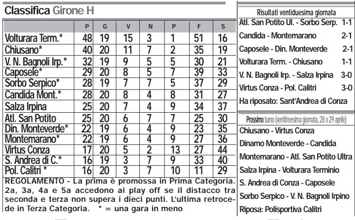 CAMPIONATO DI SECONDA CATEGORIA GIRONE “H” – NONA GIORNATA GIRONE DI RITORNO
