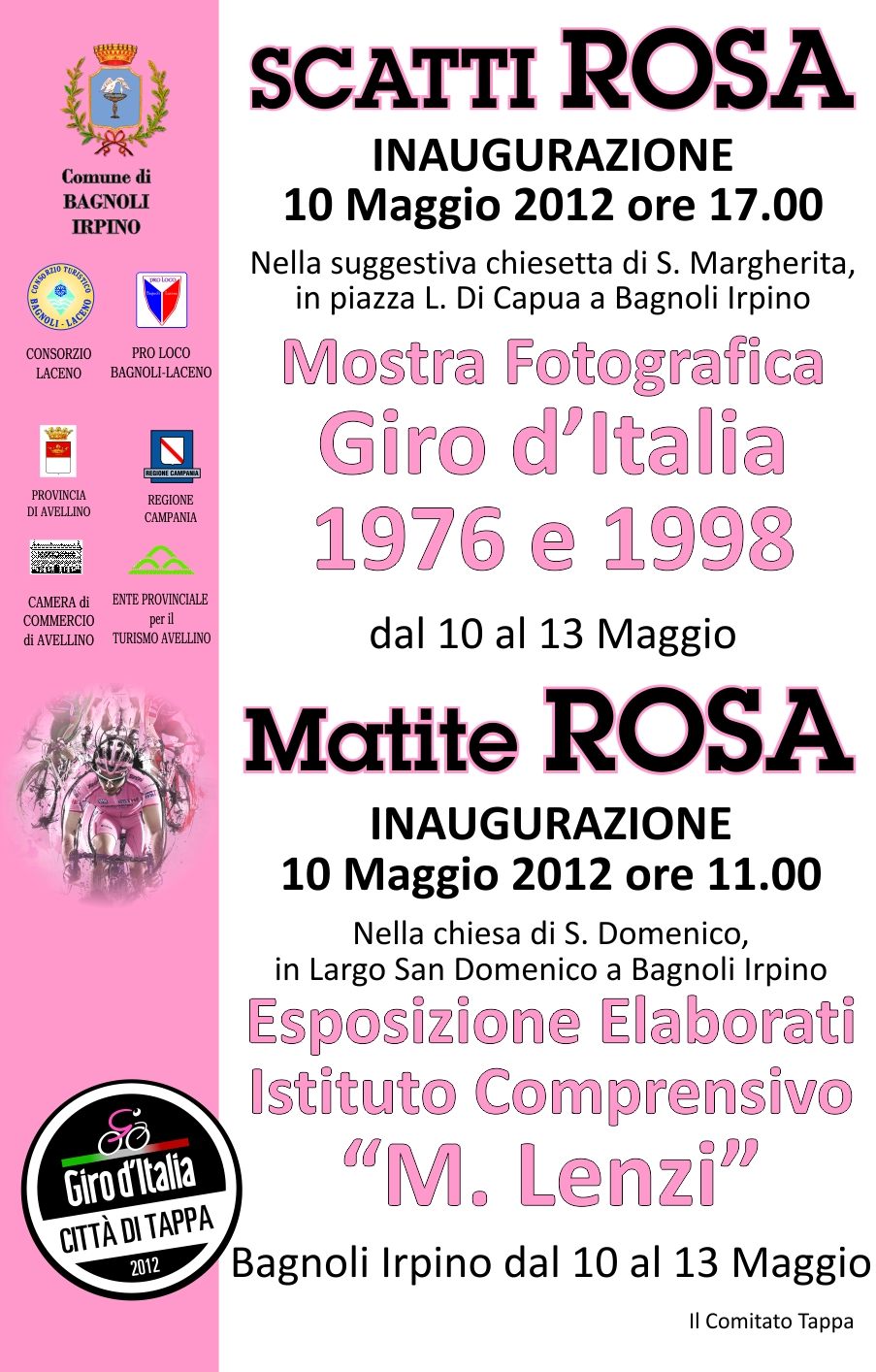 10-13 Maggio, “Matite Rosa” – Nel maestoso complesso monumentale di San Domenico, a Bagnoli Irpino, verranno esposti gli elaborati realizzati dagli alunni dell’Istituto Comprensivo “M. Lenzi” di Bagnoli Irpino sul tema del Giro d’Italia. Inaugurazione 10 maggio alle ore 11:00.