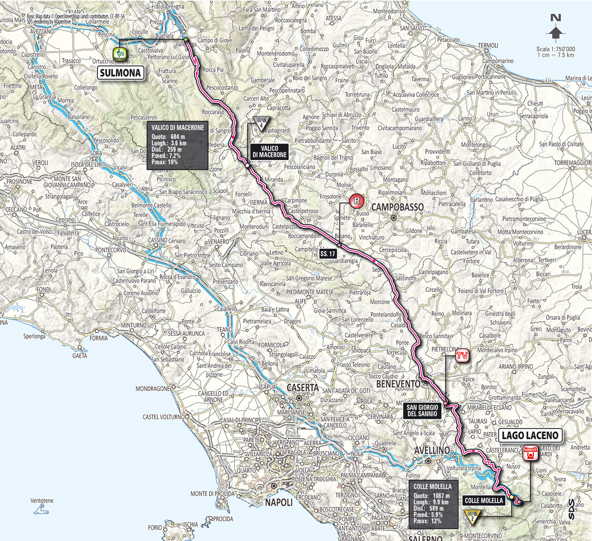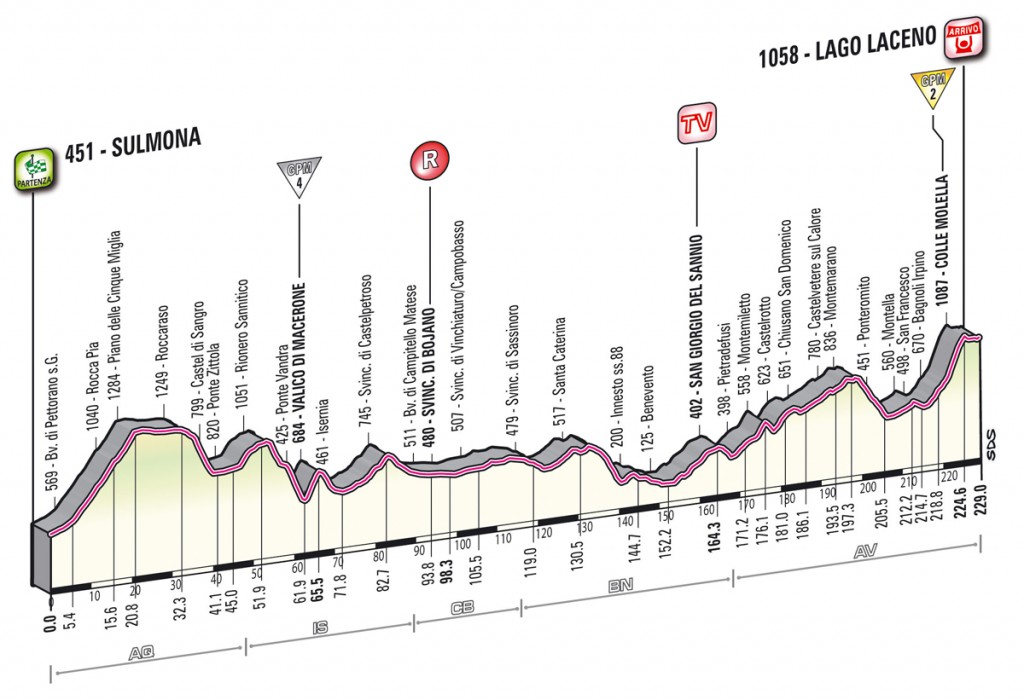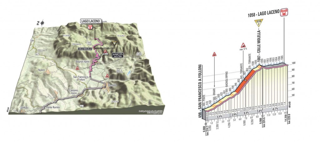 L’ottava tappa del Giro 2012, si parte da Sulmona per arrivare in Campania, a Lago Laceno. Tre i GPM (Gran Premio della Montagna) di giornata, il primo dopo pochi chilometri dal via sarà posto al Piano delle Cinquemiglia, il secondo in corrispondenza del Valico di Macerone, ed infine la salita di Colle Molella, posta sul finale di tappa, che presenterà pendenze fino al 10%.