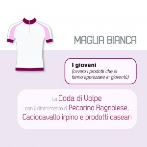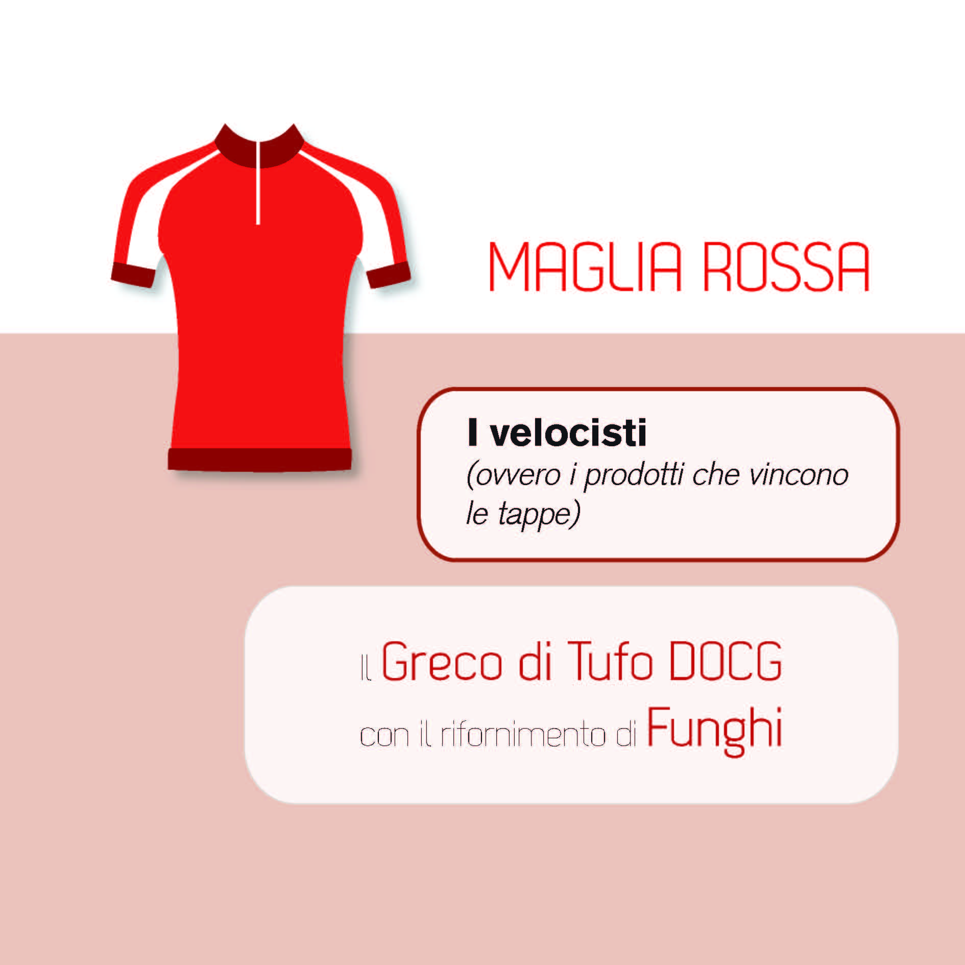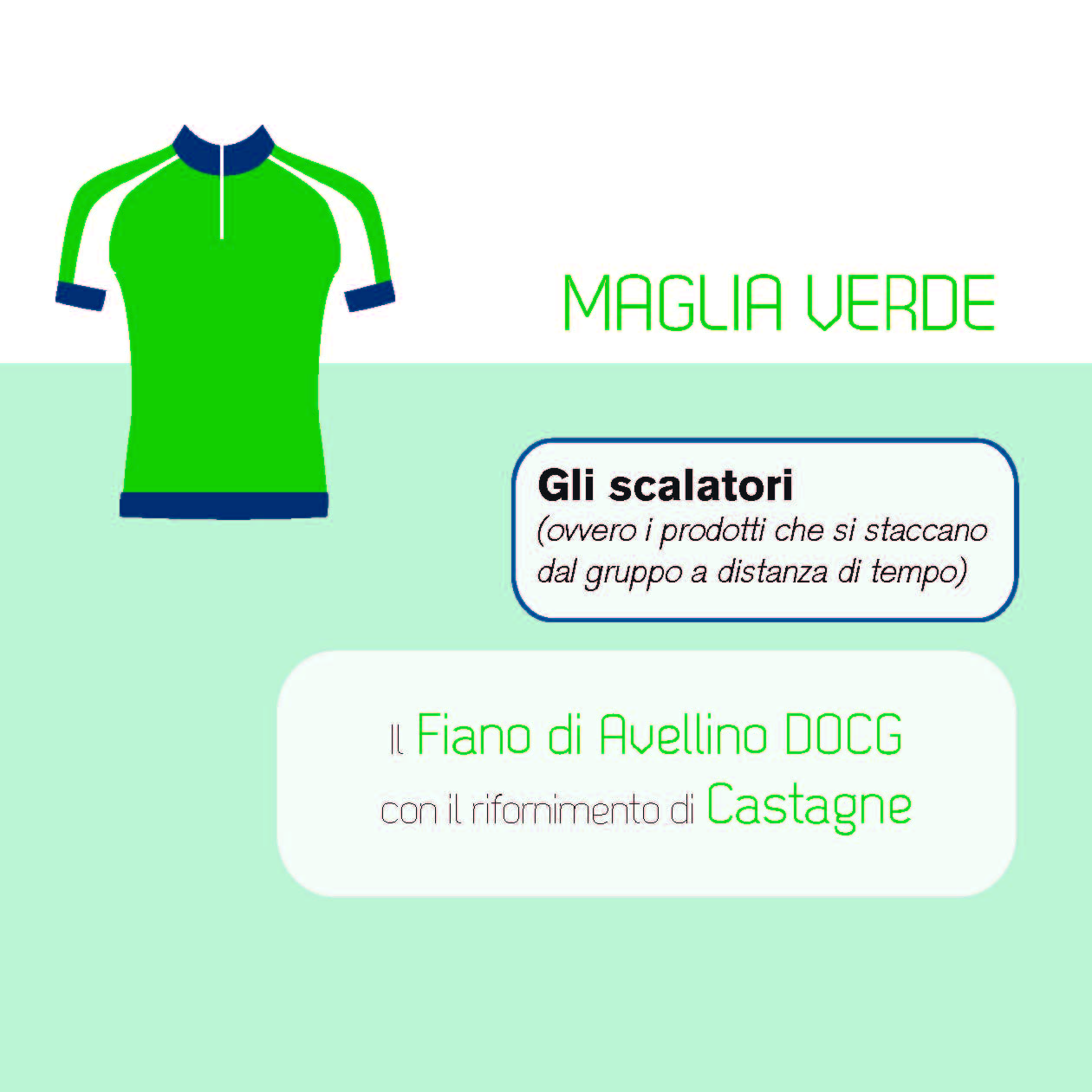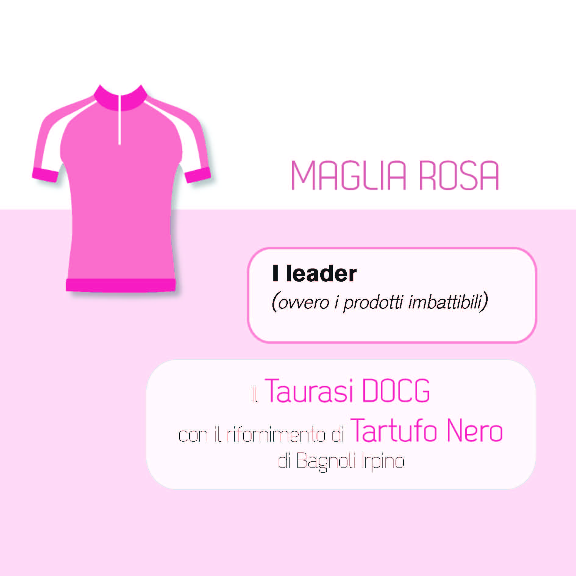 I Leader (ovvero i prodotti imbattibili) che “indosseranno” la Maglia Rosa saranno il Taurasi DOCG e il Tartufo Nero di Bagnoli Irpino. La Maglia Verde premierà gli Scalatori (ovvero i prodotti che si staccano dal gruppo a distanza di tempo): Fiano di Avellino e Castagne, mentre la Maglia Rossa andrà ai Velocisti (ovvero i prodotti che vincono le tappe): Greco di Tufo e Funghi. Infine la Maglia Bianca andrà ai Giovani (ovvero i prodotti che si fanno apprezzare in gioventù): Coda di Volpe con Pecorino Bagnolese, Caciocavallo irpino e prodotti caseari.