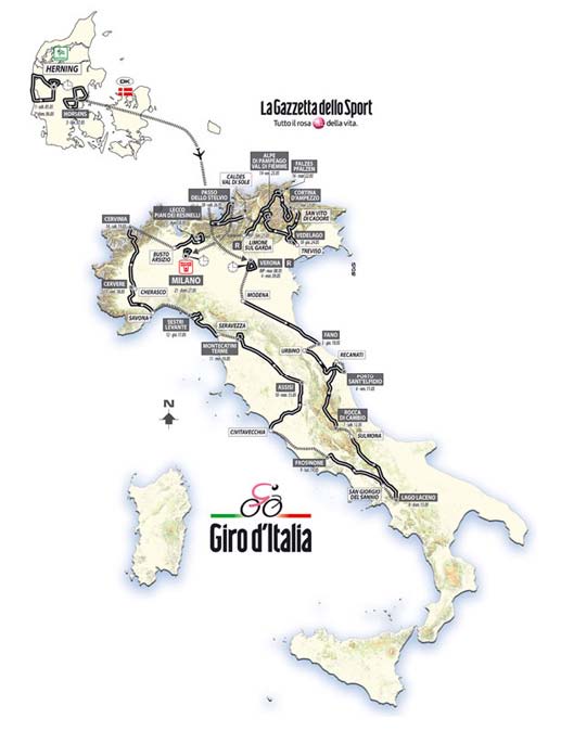 La prima tappa in Italia (dopo il trasferimento in aereo) ha toccato Verona con una cronosquadre serale. Si è scesi poi dalla costa Adriatica: Romagna, Marche, Abruzzo e Molise. Si taglierà la Basilicata per giungere sul Tirreno attraverso i monti Picentini e affrontare la Costiera Amalfitana. Si procederà verso il Lazio, la Toscana, con arrivo in salita sugli Appennini. Le montagne del Piemonte, la Val d’Aosta con Cervinia e Stelvio più Tonale e il Mortirolo (tappa votata dai lettori della Gazzetta dello Sport). Infine Milano. E’ ripresa a Verona e come di consuetudine terminerà a Milano il ventisette maggio. Di seguito l’elenco delle tappe dettagliato: