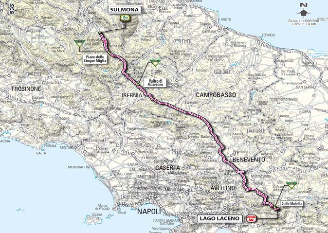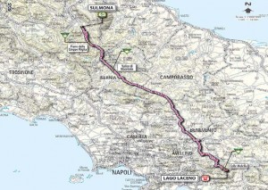L’ottava tappa del Giro d’Italia da Sulmona a Lago Laceno, oltre a presentare negli aspetti tecnici una salita nel finale, ha di sicuro altre interessanti caratteristiche. Per questo motivo, abbiamo preferito inserire anche la planimetria completa della tappa, in modo da poter visionare insieme l’intero tragitto che i corridori percorreranno per giungere sull’altopiano del Laceno. Lungo i 229 km che condurranno all’arrivo di tappa, ci saranno altri 2 gran premi della montagna, i quali anche se di minor importanza, potranno sicuramente dar luogo ad attacchi e fughe da lontano. Il primo, a pochi Km da Sulmona è il gran premio della montagna del Piano delle Cinque Miglia, situato a 1284 m di quota. Una salita di circa 21 km, con pendenze molto pedalabili, praticamente ad inizio tappa. Un trampolino di lancio per la prima fuga della giornata. Dal piano delle Cinque Miglia poi, si giungerà a Roccaraso e di li con sali e scendi continui, attraversando Castel di Sangro e Rionero Sannitico si giungerà al secondo gran premio della montagna, situato al Valico di Macerone. Una salita davvero poco impegnativa che arriva dopo lunghe discese e tratti vallonati ad appena 684 m di quota. Dal Valico del Macerone sarà un continuo percorso di sali e scendi che incrocerà località note come Campitello Matese e Santa Caterina, fino a giungere nel capoluogo di provincia Benevento. Da Benevento cominceranno i km più concitati dove il gruppo sarà già intenzionato a ricucire su eventuali fughe e ad organizzare l’assalto al valico del Colle Molella al lago Laceno. La gara avrà di sicuro un’accelerata e dopo San Giorgio del Sannio, Montemiletto, Chiusano San Domenico e Castelvetere sul Calore, a Montemarano comincerà la vera e propria bagarre per occupare i primi posti nel gruppo. Da Montella a Bagnoli Irpino poi assisteremo ad una fase concitata e piena di “sbalzi”, dove i meno adatti alle pendenze del Laceno tenteranno un allungo per anticipare gli scalatori e le squadre dei favoriti organizzeranno dei treni atti a portare i loro capitani ad affrontare la salita finale nelle prime posizioni. L’ultimo strappo che sarà poi salita vera, rappresenterà ovviamente il risvolto più interessante della gara, dove chi avrà forza e soprattutto una pedalata fluida e decisa, potrà rosicchiare secondi (non crediamo minuti) ai diretti avversari.