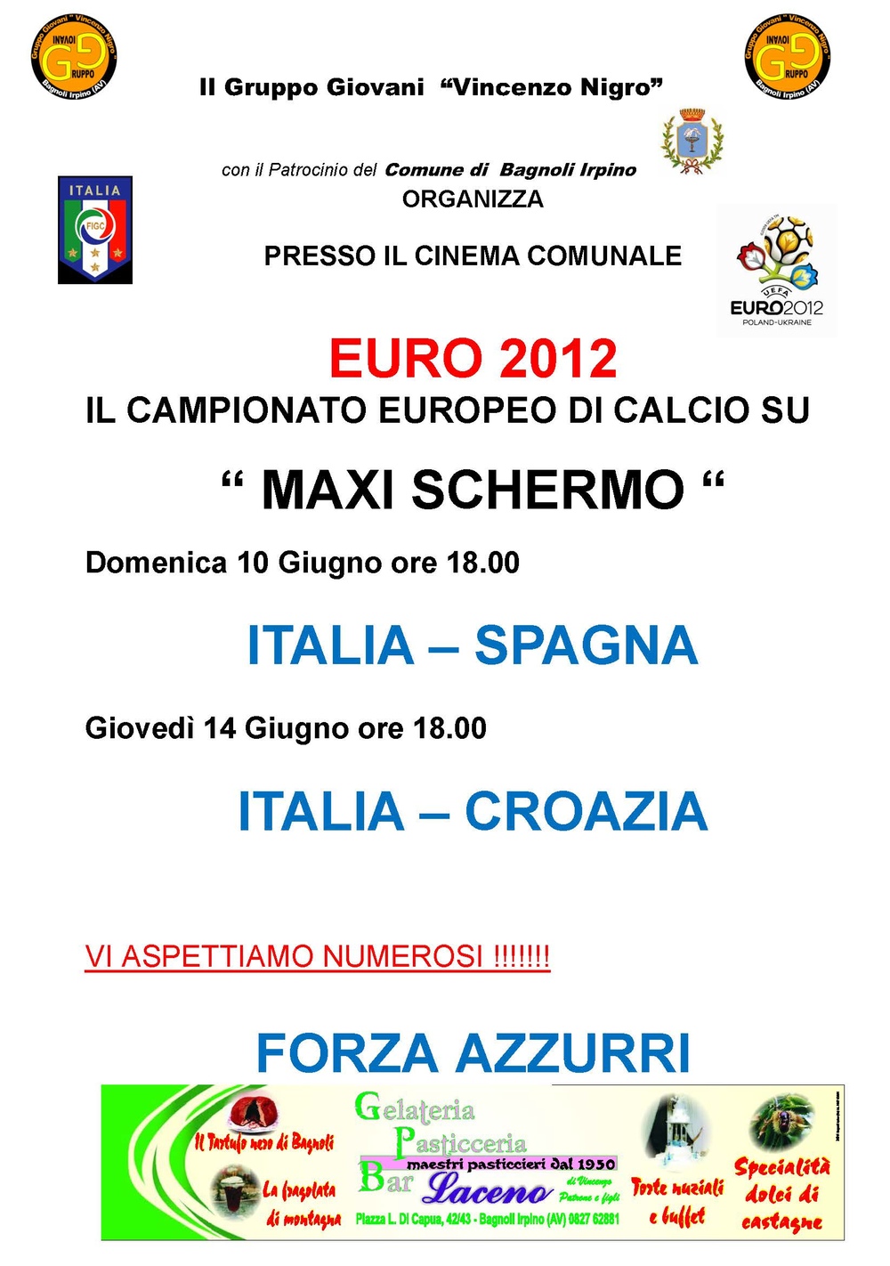 Il Gruppo Giovani “Vincenzo Nigro”, con il patrocinio del Comune di Bagnoli Irpino, organizza il “Campionato Europeo di Calcio 2012” su MAXI SCHERMO presso il Cinema Comunale. Il primo appuntamento è per domenica 10 giugno alle ore 18:00, la partita in visione è ITALIA-SPAGNA. Il secondo incontro è per giovedì 14 giugno alle ore 18:00, in programma la partita ITALIA-CROAZIA.