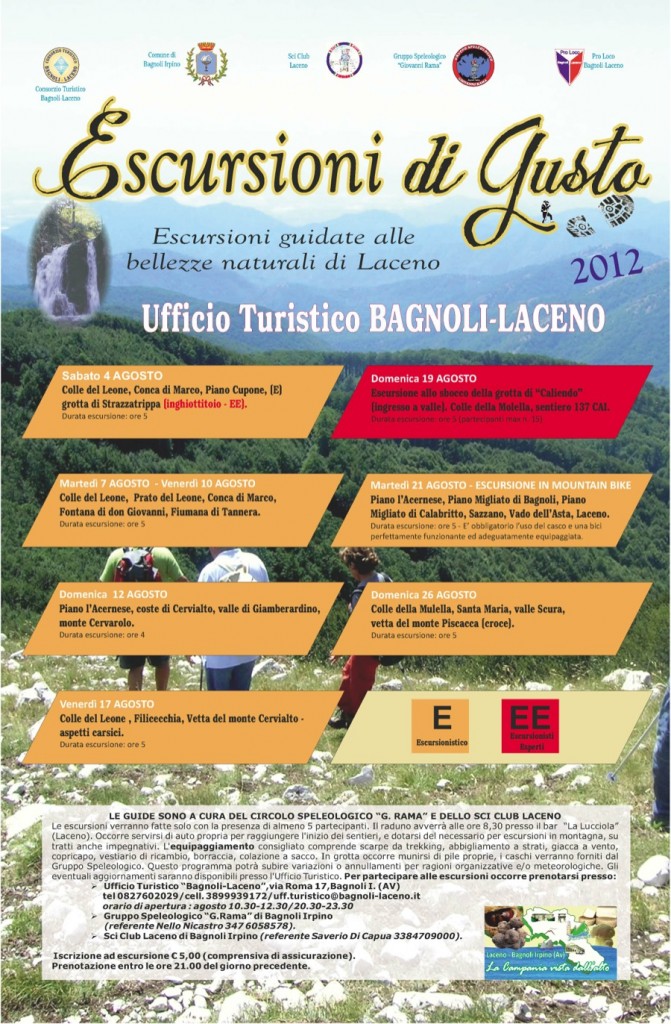 E’ stato presentato nei giorni scorsi il cartellone delle attività “ESTATE-2012” del Consorzio Turistico Bagnoli-Laceno. Al centro di tutte le manifestazioni il turismo ambientale, con ben sette “ESCURSIONI DI GUSTO” alla riscoperta delle bellezze del Laceno. Si parte sabato 4 agosto con la grotta di Strazzatrippa, e si procede poi con la fiumara di Tannera, la cima del Cervialto e del monte Piscacca, la grotta del Caliendo ed altro ancora.