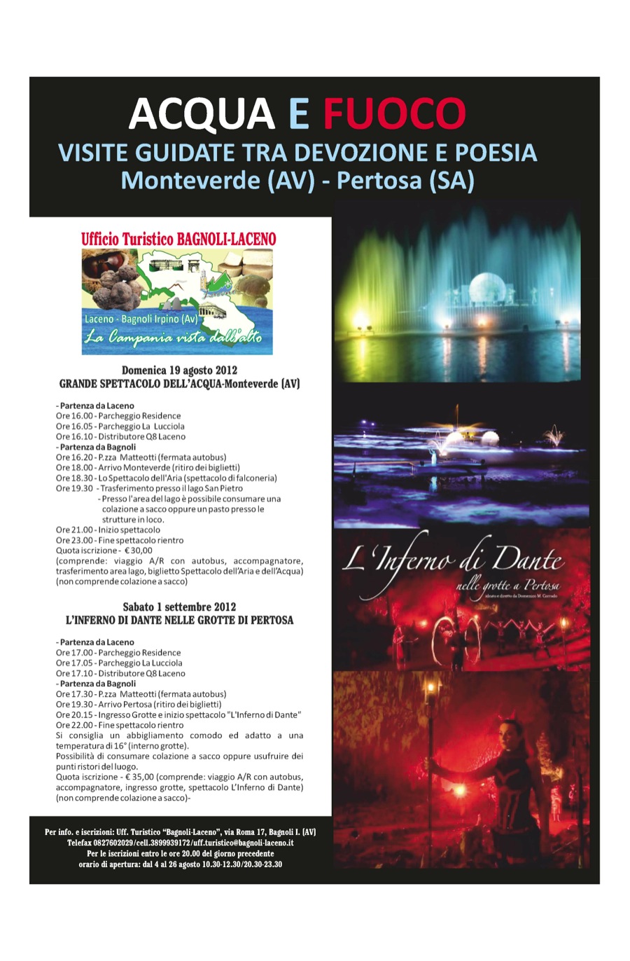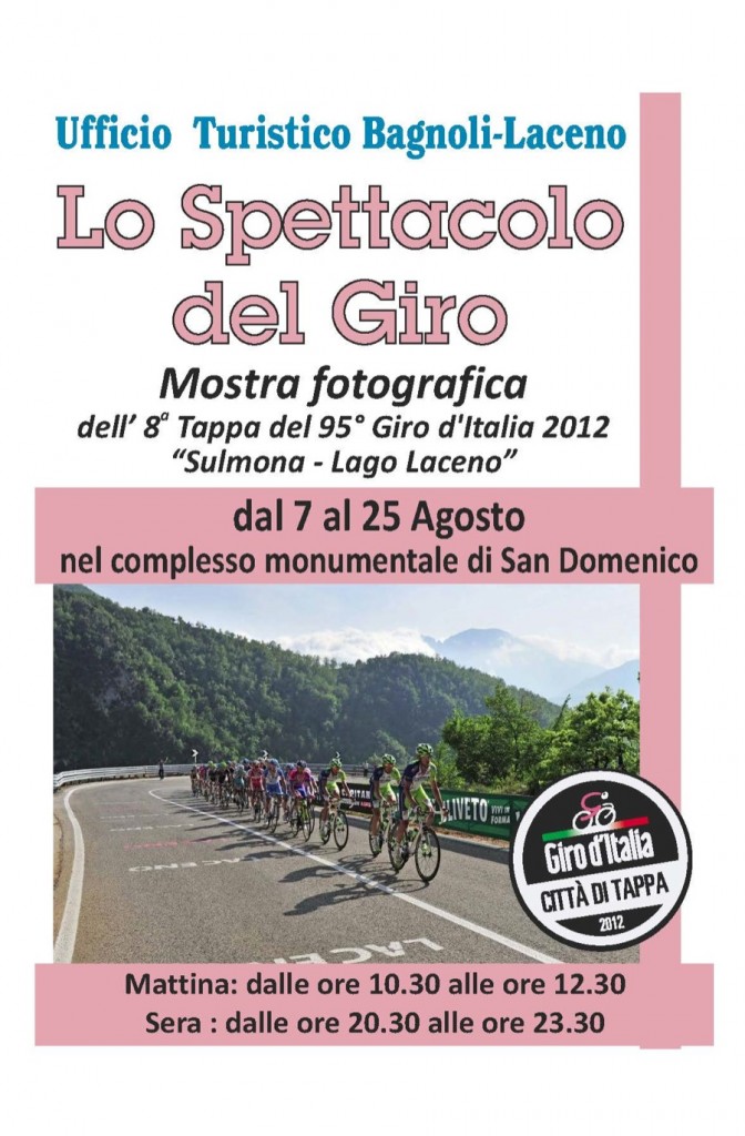 Allestita nel complesso monumentale di San Domenico, dal 7 al 25 agosto, una mostra di fotografia, “LO SPETTACOLO DEL GIRO”, tutta incentrata sull’ottava tappa del 95° Giro d’Italia Sulmona-Lago Laceno. Due le gite, tra devozione e poesia, di grande interesse: lo spettacolo dell’acqua a Monteverde il 19 agosto e l’Inferno di Dante nelle grotte di Pertosa il 1 settembre.