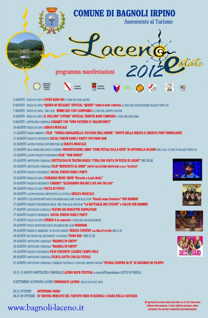 L’Assessore al Turismo del Comune di Bagnoli Irpino, Incoronata Vivolo, ha presentato ufficialmente il programma completo delle manifestazioni “LacenoEstate2012” che si terranno a Bagnoli e Laceno durante il corrente mese di agosto. Il palinsesto prevede tanta musica con le covery degli 883, dei Queen, Litfiba e diverse serate con il piano bar.