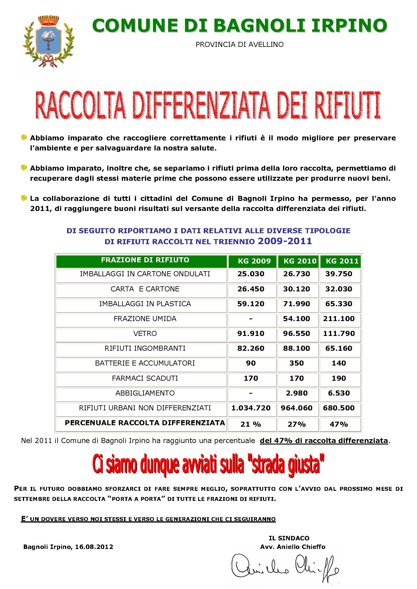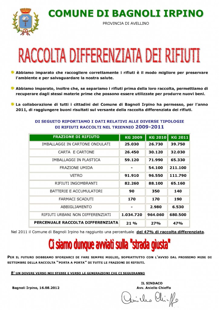 – La collaborazione di tutti i cittadini del Comune di Bagnoli Irpino ha permesso, per l’anno 2011, di raggiungere buoni risultati sul versante della raccolta differenziata dei rifiuti.