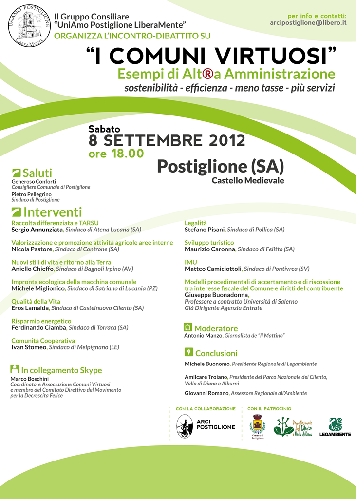 Si è tenuto nella serata di sabato 8 settembre 2012, nel Castello Medioevale di Postiglione (SA), l’incontro-dibattito dal tema: “I Comuni Virtuosi – Esempi di alt®a Amministrazione – Sostenibilità, efficienza, meno tasse, più servizi”.