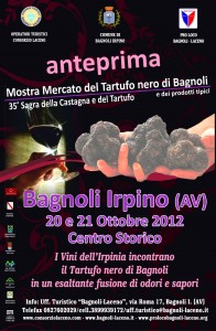 La “Mostra mercato del Tartufo nero e Sagra della castagna” di Bagnoli Irpino si terrà nei giorni 26-27 e 28 Ottobre 2012. Nell’attesa del grande evento si organizza, con una settimana di anticipo, nei giorni 20 e 21 Ottobre 2012, la terza edizione dell’ “ANTEPRIMA SAGRA”.