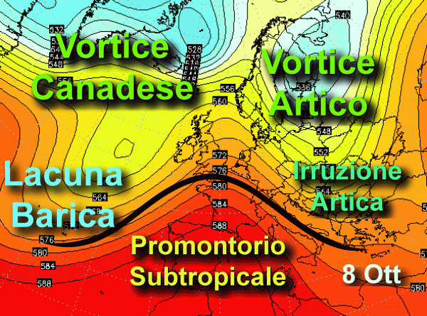 Verso il fine della settimana lo scenario offre, al momento, due ipotesi evolutive sicuramente alternative fra loro. La prima, “vista” dal modello americano GFS, vede un rafforzamento di un campo altopressorio, fra l’altro coadiuvato da un nuovo flusso caldo sub-tropicale, che ci darebbe stabilità meteorologica almeno fino alla metà della prossima settimana. La classica “ottobrata” che viene salutata positivamente un pò da tutti. La seconda ipotesi evolutiva, “vista” dalle ECMWF del modello inglese di Reading, diverge dalla prima proprio a ridosso del prossimo fine settimana. In quel frangente prenderebbe corpo un’afflusso particolarmente freddo proveniente dalla Scandinavia. L’Italia, soprattutto quella del nord-est e le zone adriatiche, sarebbero interessate da un deciso e brusco calo delle temperature che porterebbero con sè anche temporali proprio sul nord-est e una marcata instabilità nelle zone appenniniche del centro-sud. Non sarebbe difficile prevedere le prime nevicate sulle alpi centro-orientali anche a quote vicino ai 1000 metri. Imbiancate anche per i monti abruzzesi intorno ai 1500 metri.
