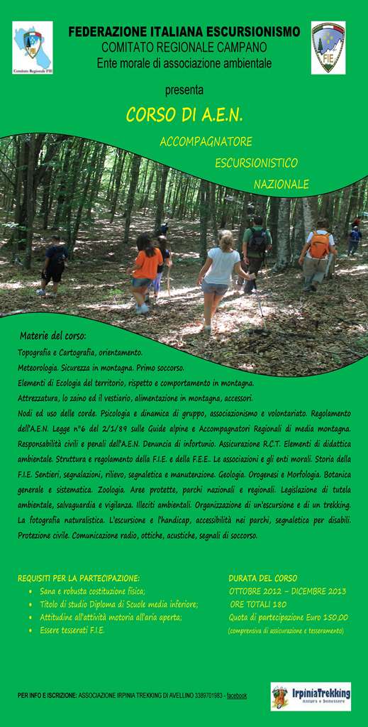La Federazione Italiana Escursionismo, Comitata Regionale Camapno, presenta il corso di A.E.N. (Accompagnatore Escursionisto Nazionale). Requisiti per la partecipazione: · Sana e robusta costituzione fisica; · Titolo di studio Diploma di Scuole media inferiore; · Attitudine all’attività motoria all’aria aperta; · Essere tesserati F.I.E. Durata del corso: ottobre 2012 – dicembre 2013; ; ore totali 180; quota di partecipazione Euro 150,00 (comprensiva di assicurazione e tesseramento) .