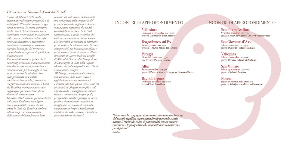A seguire il depliant dei Convegni UNESCO organizzati per l’autunno e inverno 2012 e la brochure dell’Associazione. Questo materiale promozionale è stato presentato alla Stampa a Roma il 19 settembre u.s. e sarà consegnato alle Città del Tartufo durante le Mostre Mercato del Tartufo.