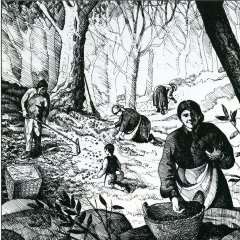 La raccolta delle castagne, come la mietitura e la vendemmia, era un momento corale nella nostra vita rurale, uno dei riti di lavoro più antichi che si celebravano nelle nostre campagne. Il padrone con tutta la famiglia e le donne assunte per un mese (perciò erano dette: mesarole) lavoravano insieme nei castagneti chini dall’alba al tramonto, al sole e al vento, raccogliendo il prezioso frutto. E per alleviare la fatica cantavano in coro le antiche canzoni di amore o di dispetto; e spesso si dividevano in due gruppi (giovani da una parte e anziani dall’altro; oppure maschi di qua e femmine di là) e si scambiavano divertenti strofette di scherno, ma senza cattiveria e senza serbare rancore. E insieme consumavano i pasti, come insieme facevano ritorno a casa, tutti infiacchiti dalla fatica. E insieme si godeva dell’abbondanza della raccolta: generosamente il padrone consentiva alle sue lavoranti di portare a casa una grembiulata di castagne da conservare per le caldarroste di Natale. Perché i vecchi di una volta così dicevano: “Quando è tempo di castagne, tutti mangiano le castagne; come quando si ammazza il maiale, e si mangia tutti la carne. Inoltre i contadini, dopo il due novembre, lasciavano i loro fondi a chi non aveva castagneti per permettere loro di farsi una provvista per l’inverno; e queste castagne, per antica tradizione, erano dette “le castagne dei poveri”. C’è un’antica leggenda qui in Irpinia che rivela che all’origine le castagne erano un bene comune; e non c’erano né padroni né garzoni. Sentite.