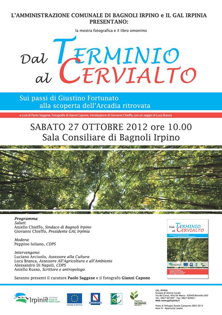 In occasione della Mostra Mercato del Tartufo Nero – Sagra della Castagna e del Tartufo di Bagnoli Irpino (26, 27 e 28 ottobre 2012) – 35esima edizione, l’Amministrazione comunale di Bagnoli Irpino e il Gal Irpinia presentano il 27 ottobre al Comune di Bagnoli la Mostra fotografica e il libro omonimo ‘Dal Terminio al Cervialto. Sui passi di Giustino Fortunato alla scoperta dell’Arcadia ritrovata‘, a cura di Paolo Saggese (fotografie di Gianni Capone).