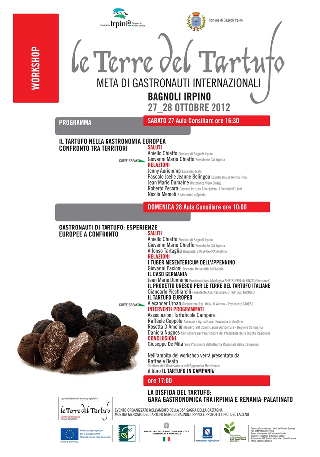 “Il tartufo nella gastronomia europea: confronti fra territori”: questo il titolo del primo workshop che si terrà sabato 27 ottobre, alle ore 16.30, nell’aula consiliare del Comune di Bagnoli Irpino. Organizzato dal Gal Irpinia in partnership con l’Amministrazione del paese alle falde dell’altopiano del Laceno, il seminario s’inserisce nella ricca cornice di eventi del più atteso festival del gusto autunnale campano. All’iniziativa interverranno Aniello Chieffo, sindaco di Bagnoli Irpino, e Giovanni Maria Chieffo, presidente del Gal Irpinia. Poi le relazioni culinarie di Jenny Auriemma (Locanda di Bù), Pascale Joele Jeanne Belingou (Country House Nonna Pina), Jean-Marie Dumaine (Ristorante Vieux Sinzig nonchè presidente dell’Associazione micologica tedesca “Ahrtruffel”), e Nicola Memoli (Ristorante Lo Spiedo).