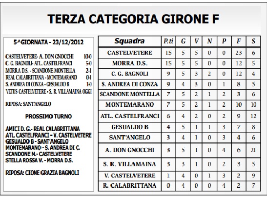 “Manita” del Cione Grazia che in casa dà una scoppola al malcapitato Atletico Castelfranci, consolida il terzo posto a quota 11 punti e saluta il 2012 come meglio non poteva. Un 5 a 0 secco, senza se e senza ma, non c’è storia, c’è la supremazia del Cione Grazia che da 1’ al 90’ martella la difesa avversaria senza sosta, una squadra che anche se non ancora perfettamente registrata gira a mille e con facilità passeggia sugli avversari di turno, potendo ancora oggi recriminare per i due pareggi interni che sanno di punti persi e che l’avrebbero portata al vertice della classifica, ma tant’è, e il tempo per recuperare di certo non manca.