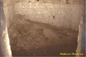 «Il primo vano è profondo all’incirca quattro metri, mentre il secondo lo è molto di più (la scala non sarebbe bastata per scendere ancora). Tutto il terreno è cosparso di resti umani, immondizia, ciottoli, legni e cocci. Nella prima stanza in cui s’accede appena scesi si trovano due mezzi-busti femminili in legno posti appositamente uno di fronte all’altro prima dell’ingresso alla successiva stanza. Queste statue sono in condizioni critiche vorrei tanto fossero recuperate, ma non credo si riesca più a restaurarle. Una non si sa cosa rappresenti essendo caduta a faccia in giù e l’altra rappresenta una figura femminile dalle mani appositamente mozzate e gli occhi cavi. Intorno alle due statue ci sono tantissimi lumini. Potrebbero raffigurare le cosiddette “piangenti”: sculture che avevano il compito di vegliare e piangere per i morti, legate a antiche tradizioni romane conservatesi nel meridione. Quest’usanza la ritroviamo anche nelle “chiangi-muorti” donne pagate per piangere ai funerali. Comunque questa è solo un’ipotesi. L’intera stanza è cosparsa di ossa ed in un angolo sono presenti cinque casse in legno colme di ossa. Dopo troviamo un’apertura che porta alla cripta vera e propria quella grande, un’immensa vasca sotto l’altare. La stanza era così grande che non sono riuscito a prenderla tutta con una foto. Dalla porta presumibilmente venivano gettati giù i morti insieme a del terriccio, oltre a questo sono stati gettati anche dei rifiuti durante i lavori del 1939 e una grande statua in legno alta un metro e mezzo o due situata sotto la porta d’ingresso rappresentante sempre una figura femminile. Presumibilmente la statua non servendo più fu gettata giù, questo spiegherebbe la sua posizione casuale. Per scendere in quest’ambiente c’è bisogno di una scala essendo molto profondo, non sappiamo se giù ci siano altre aperture o botole che si aprano al livello del pavimento essendo stato riempito. Sul soffitto vediamo una botola che si apre proprio dinanzi l’altare e sul muro opposto all’entrata ci sono varie aperture chiuse dalla terra. Una di queste dirimpetto alla porta d’ingresso di forma rettangolare (in cui potrebbe passare un uomo a gattoni) forse se ripulita potrebbe portare alla vecchia cripta situata lì vicino, ma è solo un ipotesi».