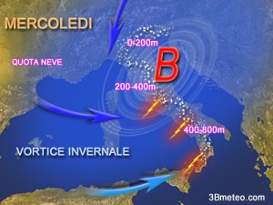 Praticamente anche se lo 0° termico si troverebbe vicino alla quota dei 1000 metri, la neve imbiancherà anche le basse colline (300-400 metri).