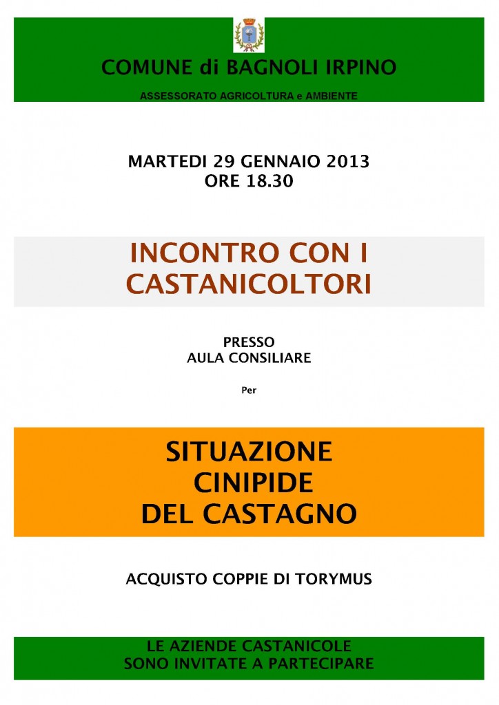 Martedì 29 gennaio 2013 ore 18:30 presso l’Aula Consiliare in Via Roma a Bagnoli irpino l’Assessore all’Agricoltura e Ambiente Luca Branca incontra la cittadinanza sul tema “Situazione del comparto castanicolo”. Si discuterà in particolare del cinipide calligeno e delle diverse attività in programmazione per l’anno 2013. Le aziende castanicole sono invitate a partecipare.