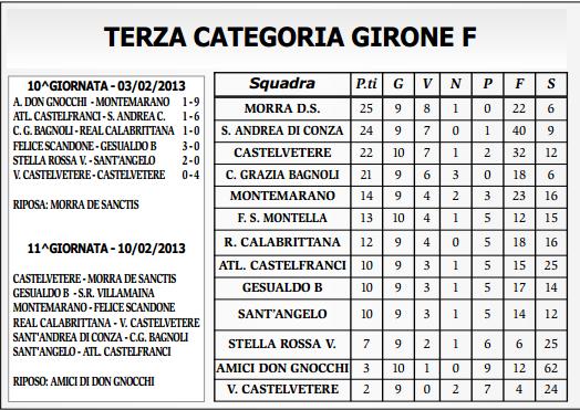 Il campionato è lungo, le insidie sono tante, ancora non si è arrivati al giro di boa ma le gerarchie che si sono create sono ben chiare, il titolo è una lotta a 4, una lotta che vedrà sicuramente trionfare chi nei vari scontri diretti farà valere la propria supremazia, la settimana prossima l’impegno è di quelli importanti, in quel di Sant’Andrea di Conza attualmente seconda forza, il Cione Grazia è stato bravissimo ad uscire indenne e anzi quasi trionfante dal doppio impegno Morra – Castelvetere, ancora una prova di forza gli è richiesto, non è un ulteriore esame ma potrebbe essere la definitiva consacrazione, nel frattempo ci si gode questo terzo posto momentaneo e la consapevolezza di essere con e tra i migliori.