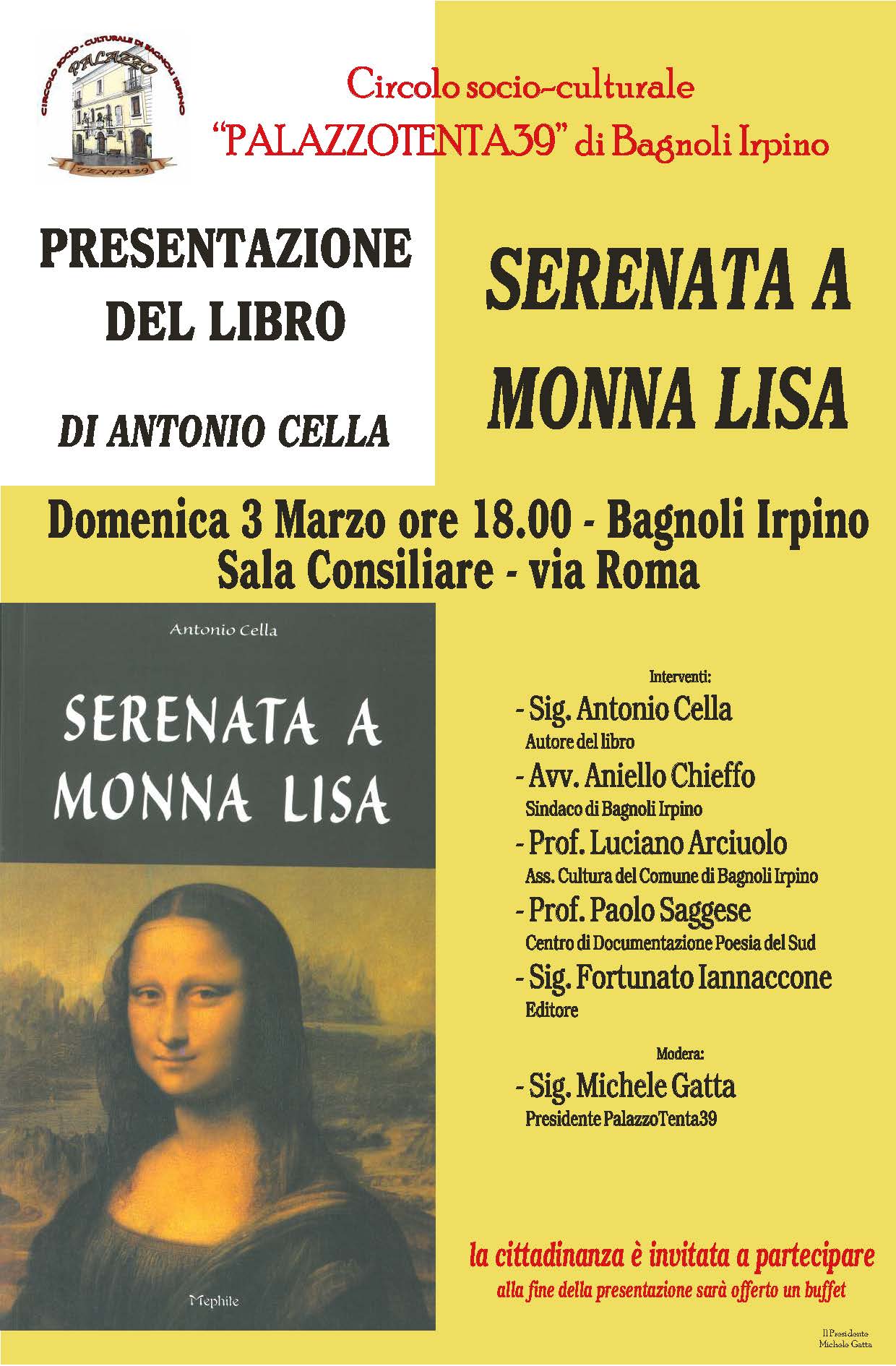 L’Associazione socio-culturale “Palazzo Tenta 39″ PRESENTA il libro “Serenata a Monna Lisa”” di Antonio Cella. L’appuntamento è per Domenica 3 Marzo 2013, alle ore 18:00, presso la Sala Consiliare (ex Santa Caterina) in Via Roma a Bagnoli.
