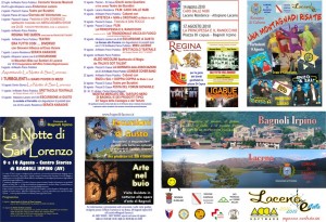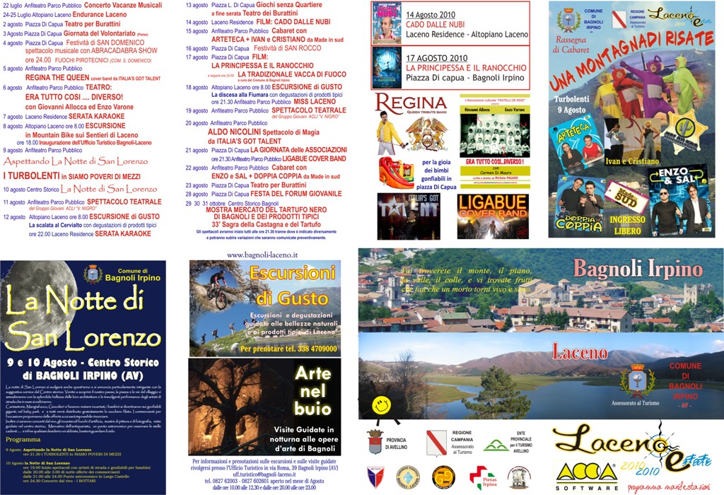 Segnaliamo in esclusiva per la Campania i Regina The Queen cover band dell’omonimo gruppo reduce dai grandi successi ottenuti in TV a Canale 5 nella trasmissione ITALIA’S GOT TALENT il giorno dopo il 6 Agosto sarà la volta di due grandi interpreti che lo scorso anno nella stessa platea di Bagnoli hanno riscosso un enorme successo, si tratta di Giovanni Allocca e Enzo Varone che intepretarono l’Eneide di Virgilio. Quest’anno proporranno un esilarante commedia dal titolo ERA TUTTO COSI’ DIVERSO. Il 9 Agosto si continuerà a ridere a crepapelle, sicuramente con lo spettacolo più importante della stagione: i Turbolenti direttamente dalla trasmissione di successo Colorado Cafè proporranno all’appassionato pubblico il loro spettacolo “Siamo poveri di mezzi”, certamente per la gioia di grandi e piccini non faranno mancare il loro cavallo di battaglia i Turbotubbies. La notte di San Lorenzo si svolgerà anche quest’anno il 10 Agosto e si annuncia particolarmente intrigante con la suggestiva cornice del Centro storico. della piazza e delle vie del villaggio che vi ammalieranno con la splendida bellezza delle loro architetture e le travolgenti performance degli artisti di strada che in esse si esibiranno.