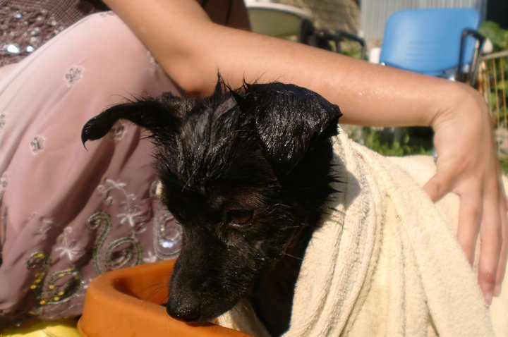 Neria è stata abbandonata, poco dopo essere nata, in un secchio della spazzatura, ciononostante adesso sembra non aver paura dell’uomo, corre, salta e fa le feste quando le portano il cibo.