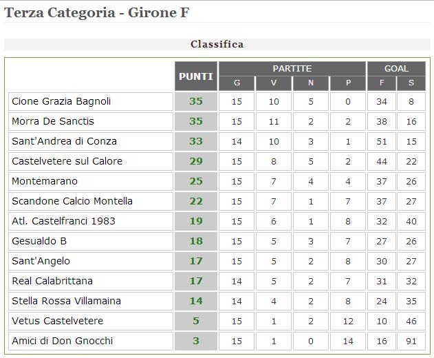 In virtù del pareggio del Morra a Montemarano e contemporaneamente del turno di riposo del Sant’Andrea la classifica recita così: Bagnoli e Morra 35 punti, Sant’Andrea 33 punti e Castelvetere 29 punti. E ora la mini-sosta pasquale utile ad mettere sotto la lente d’ingrandimento tutti i numeri di questa squadra per realizzarne le dovute analisi e considerazioni: 35 punti in 15 gare, 2.33 media punti per gara, 10 vittorie, 5 pareggi, 0 sconfitte, 7 gare casalinghe con 4 vittorie e 3 pareggi (15 punti) e una media interna di 2.14 punti per gara, 8 gare esterne con 6 vittorie e 2 pareggi (20 punti) e una media di 2.5 punti per gara, complessivamente 34 gol fatti (2.27 per gara) e 8 gol subiti (0.53 per gara), di cui 22 gol fatti ( 3.14 media) e 4 subiti (0.57 media) in casa e 12 gol fatti (1.5 media) e 4 subiti (0,5 media) fuori casa. I numeri dicono che il Cione Grazia vanta “solo” il sesto miglior attacco, un’anomalia se si pensa al primato, e la miglior difesa, il che rende logico ed equidistribuito il rapporto complessivo tra punti, gol realizzati e subiti. Ripetiamo ancora una volta come il punto di forza di questa squadra sia concentrata proprio nella massima affidabilità del pacchetto arretrato e nella capacità di centellinare la media realizzativa in ogni singola gara del reparto offensivo, andato sempre a segno, nonché l’imbattibilità mantenuta per tutte le 15 gare, indice della volontà e della caparbietà di questi ragazzi nel voler raggiungere sempre il risultato, con alcuni punti persi per strada nella prima parte, ampiamente compensati dai risultati acciuffati in extremis negli ultimi tempi. Insomma la giusta miscela della classica squadra all’italiana: pochi gol, difesa impenetrabile e tantissimo cuore.