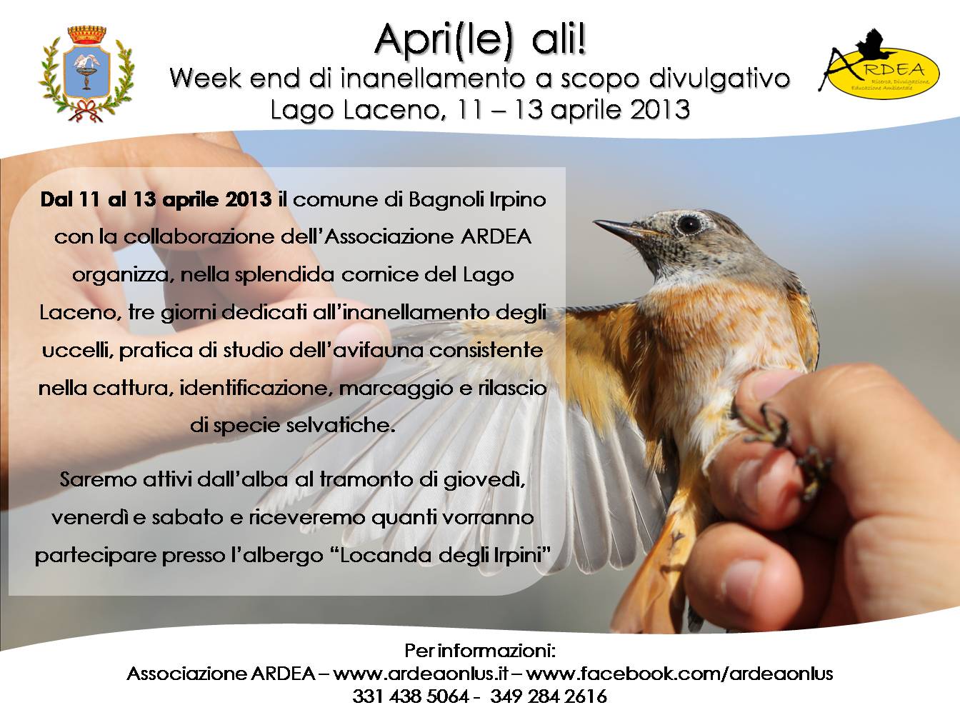 Dal 11 al 13 aprile 2013 il Comune di Bagnoli Irpino, con la collaborazione dell’Associazione ARDEA e gli alunni dell’Istituo Comprensivo Michele Lenzi, organizza nella splendida cornice del Lago Lacewno, tre giorni dedicati all’inanellamento degli uccelli, pratico di studio dell’avifauna consistente nella cattura, identificazione, marcaggio e rilascio di specie selvatiche. Saranno attivi dall’albo al tramonto di giovedì, venerdì e sabato e riceveranno quanti vorranno partecipare presso l’albergo “Locanda degli Irpini”.
