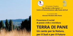 L’Amministrazione Comunale di Bagnoli Irpino, l’Associazione Palazzo Tenta 39, il Comitato Cittadino “No Petrolio Alta Irpinia” e il Centro di Documentazione sulla Poesia del Sud presentano il recital di poesia civile e meridiana TERRA DI PANE – NO PETROLIO.  Un canto per la Natura, per il Sud e per il Futuro.