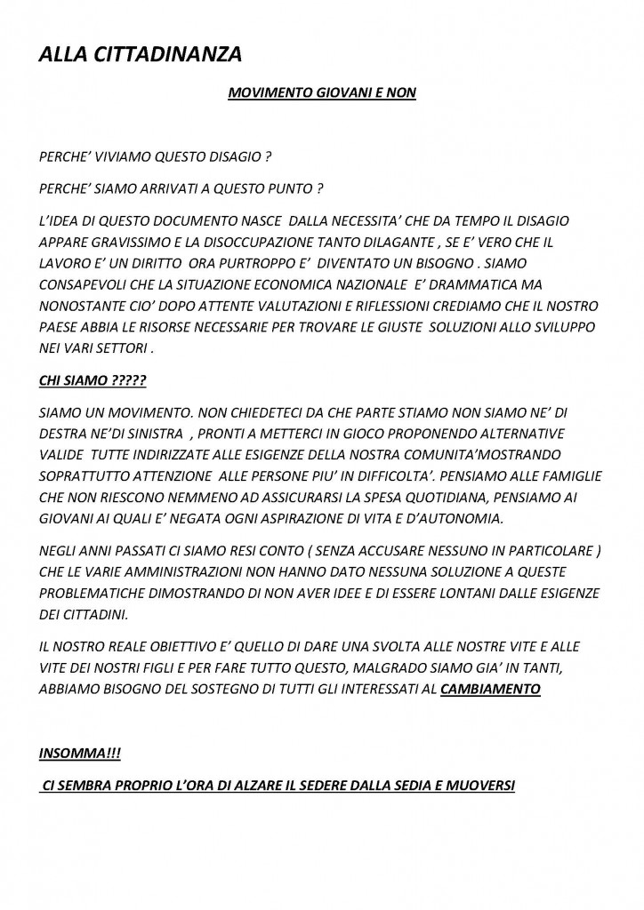 Siamo un movimento. Non chiedeteci da che parte stiamo non siamo ne’ di destra ne’di sinistra, pronti a metterci in gioco proponendo alternative valide tutte indirizzate alle esigenze della nostra comunita’ mostrando soprattutto attenzione alle persone piu’ in difficolta’. Pensiamo alle famiglie che non riescono nemmeno ad assicurarsi la spesa quotidiana, pensiamo ai giovani ai quali e’ negata ogni aspirazione di vita e d’autonomia.