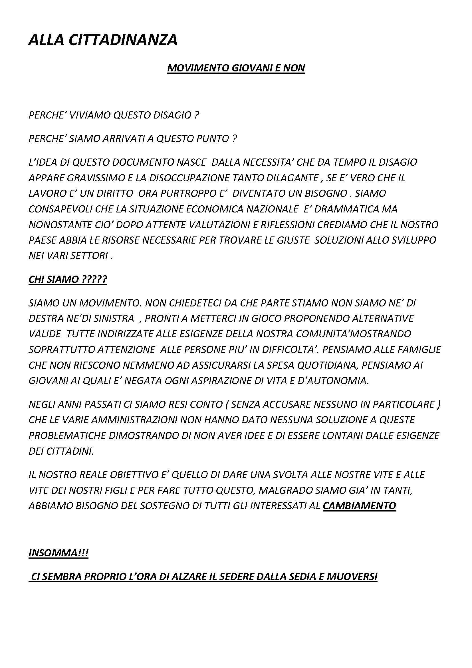 (*) In rappresentanza provvisoria del neonato “Movimento Giovani e non” vengono segnalati i seguenti nominativi: