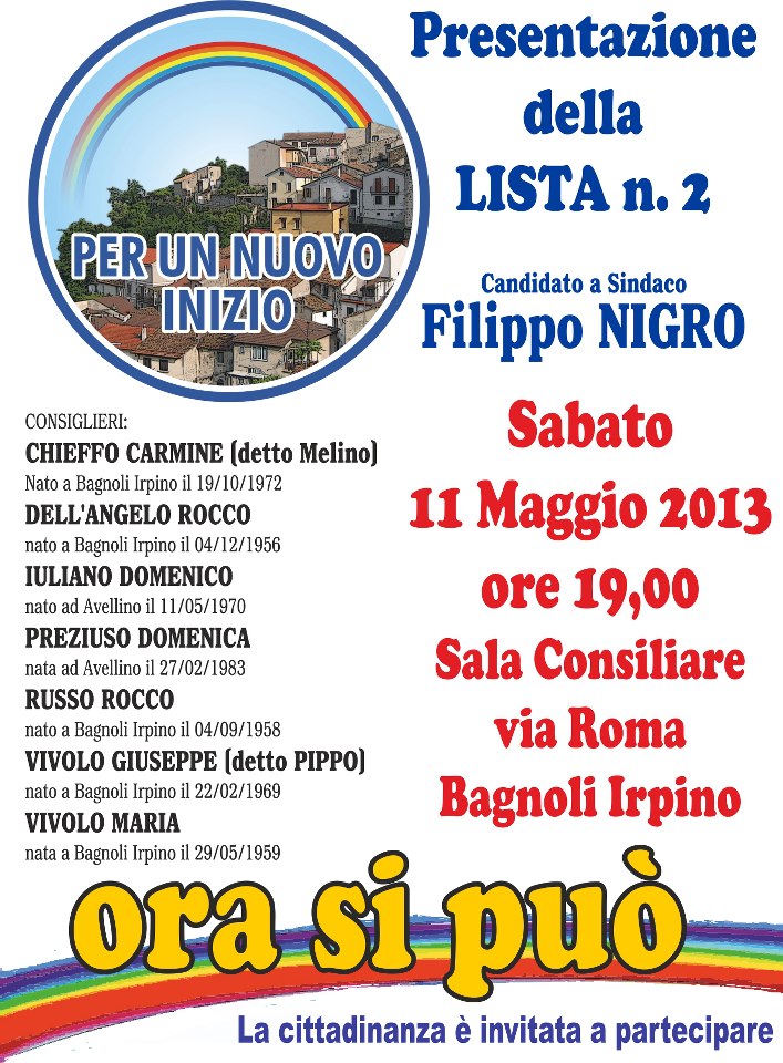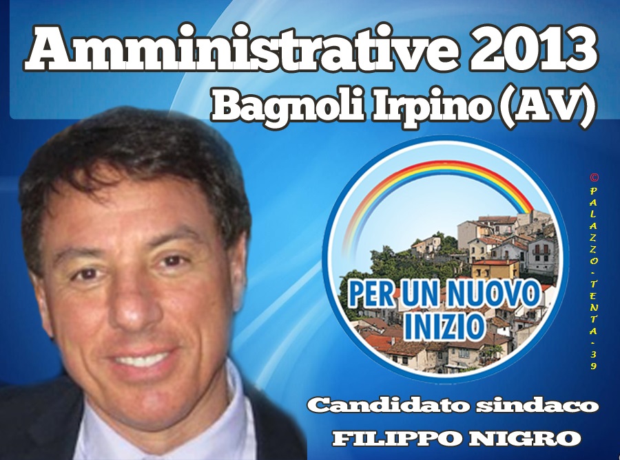 Sarà poi la volta dello sfidante Filippo Nigro (sabato sera ore 19:00) a capo della lista “Per un Nuovo Inizio” di cui fanno parte Carmine Chieffo, Rocco Dell’Angelo, Domenico Iuliano, Domenica Prezioso, Rocco Russo, Giuseppe Vivolo e Maria Vivolo.